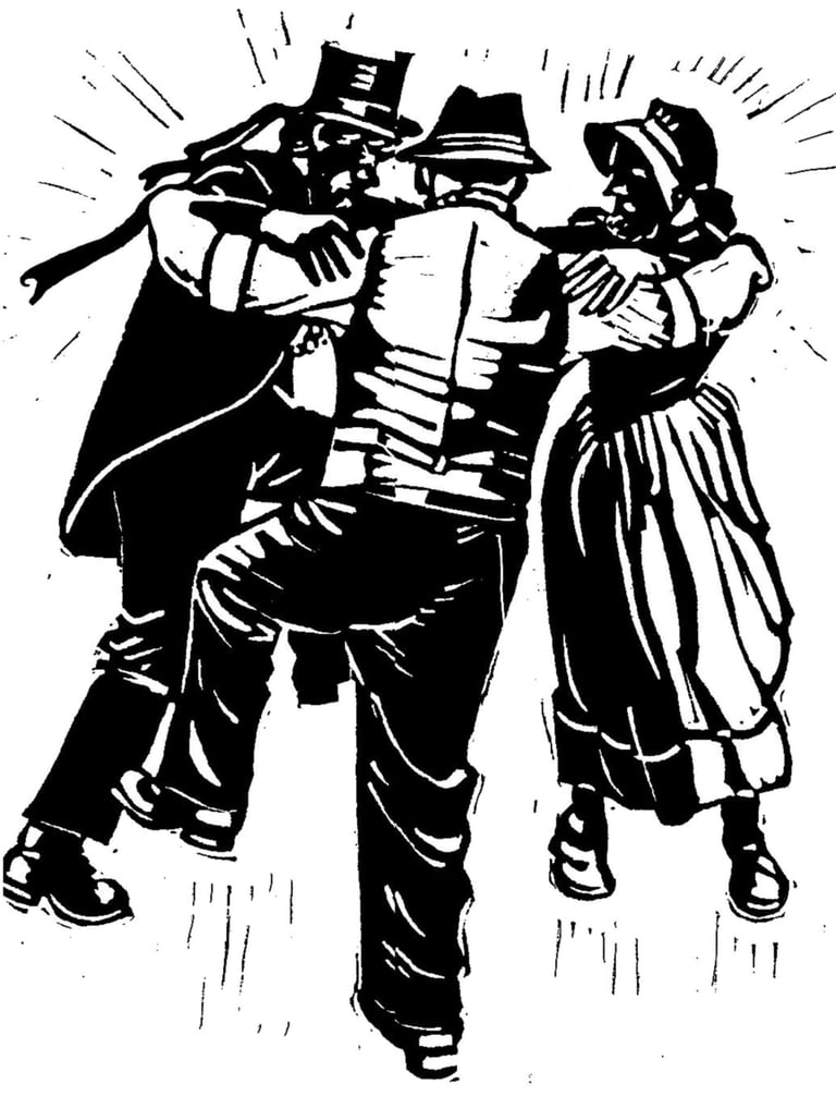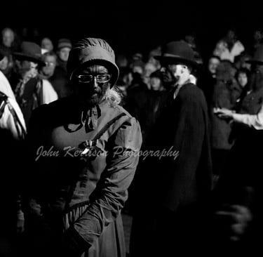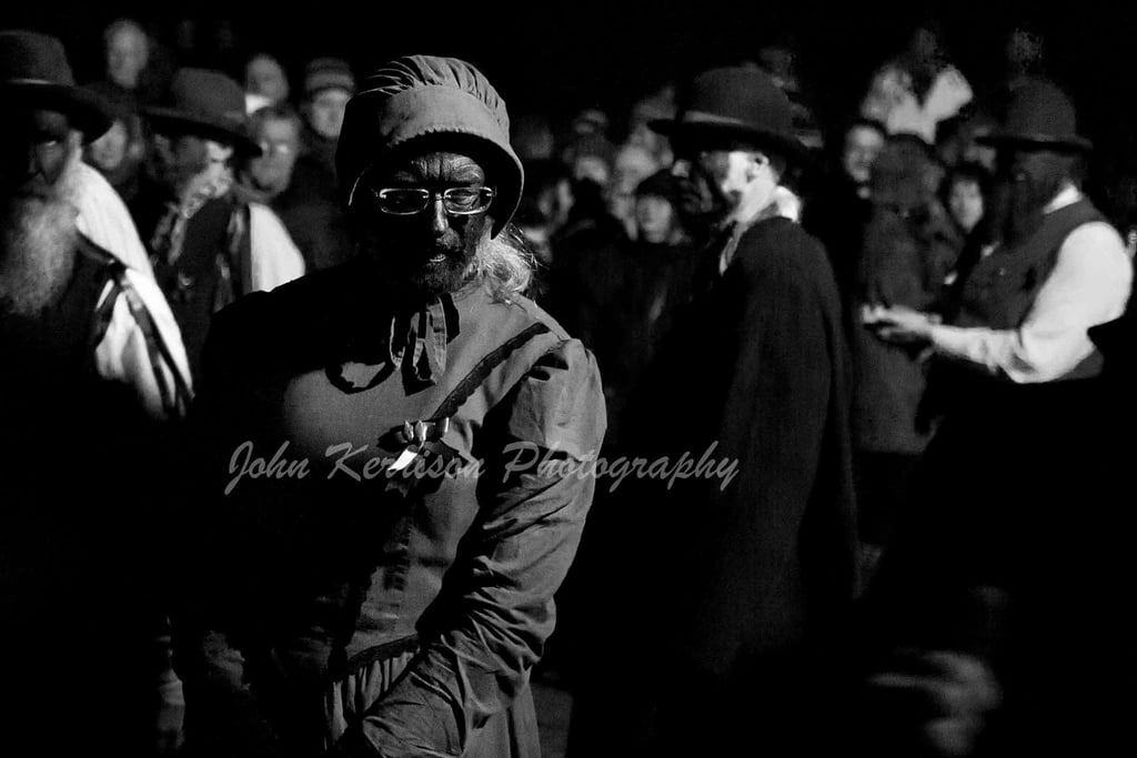 Dancers would be all male, dressed as Victorian/Edwardian farm labourers in collarless shirt, waistcoat bedecked with ribbons, neckerchief, brown corduroy trousers and black boots, preferably hobnailed. We initially decided on a flat cap, but later changed to a trilby-style hat. Bearing in mind that we intended to perform only in winter, we agreed that, when not dancing, the men would wear a dark overcoat. Two of the dancers would be appropriately attired as Lord and Lady, the latter fulfilling the requirement for the presence of a ‘molly’. Musicians would be all female, dressed in dark coats and wearing hats adorned with ivy. Initially it was just a small sprig, but later on it became more and more elaborate (and heavy). The musicians would also have a green sash. Other characters would include a whiffler, who would be responsible for marshalling the dancers, an umbrella man, who would act as announcer, a box-man (or a collector of some sort) and a broom-man, who would clear the way for the dancers. Everyone would be disguised by the use of black face paint. At that time, nobody made a fuss about black face paint; it was many years later when Old Glory, as it became, decided to change to grey as a matter of self-preservation.